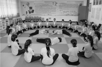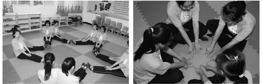 小结:京特学校的律动和舞蹈课程提出了“开放空间”的概念,这一概念背后的情感基调来源于对人类的命运及人性的唤醒,使人类意识到自己的身体可以在空间中自由地移动、自由地舒展,并思考如何使用身边的空间。本游戏通过借助发音管玩二人、三人甚至四人、五人的合作游戏,在游戏中学生可以自由地去探索、利用身边的空间,尽情地舒展自己的身心,并在轻松、愉快的表演中,体验三维的立体空间关系。