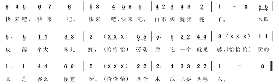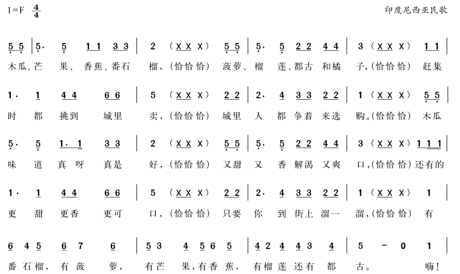 4.赏析歌曲的内容与特点,了解这是一首以叫卖为题材的印尼民歌。歌曲节奏欢快、旋律活泼,形象地塑造了印尼农民在兜售自产水果时的忙碌场景。歌曲的结构具有循环性,每一段落可以不断反复,在实际演奏时如果没有乐队鼓手的暗示,乐曲将无休止地循环下去,这一特征与印尼宗教的“轮回”观念有关。