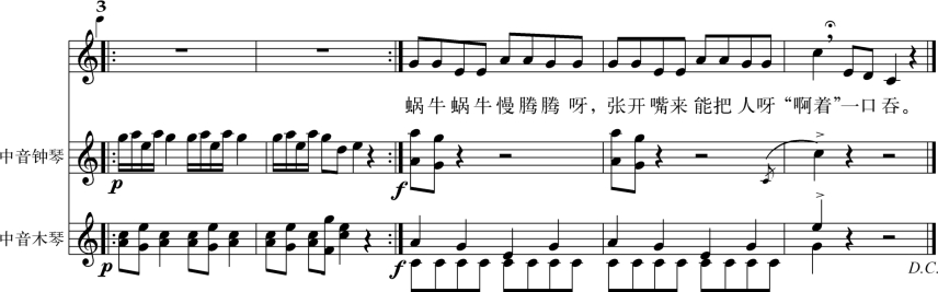 (4)不断交换声部,进行合奏练习。强调速度缓慢,节奏稳定,像蜗牛爬行一样,一步一步的,慢腾腾的。
