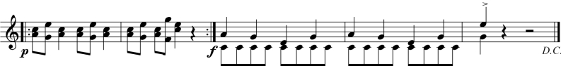 (2)所有学生用八分音符节奏进行单音伴奏,可使用五声调式内任何一音,要求每遍歌曲尝试不同旋律,尽可能地探索各种旋律线条。如: