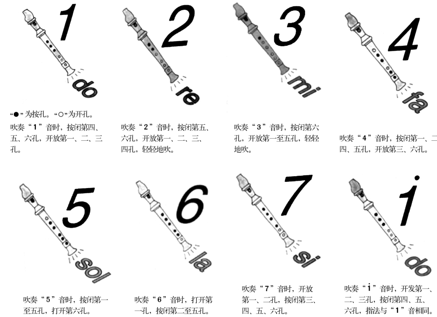 目标:了解竖笛的三种基本吹奏法,学习并掌握音阶中各音的位置及奏法。