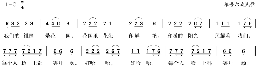 提示:游戏《咿呀咿呀呦》最后的作品一共由七个部分组成,第一、三、五、七部分演唱歌曲,第二、四、六部分分别插入三个不同的新创编的歌词。第三、五、七部分是对第一部分歌曲的重复演唱,而第二、四、六部则是按歌曲中“咿呀咿呀哟”乐句节奏、旋律进行仿编,是对歌曲的进一步的展开。