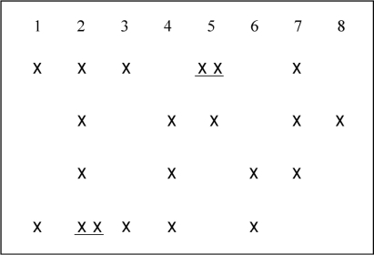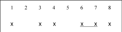 (1)教师在黑板上重新写下八个数字,依据这八个数字进行节奏创编练习。如在八个数字下面,老师给出一个节奏型: