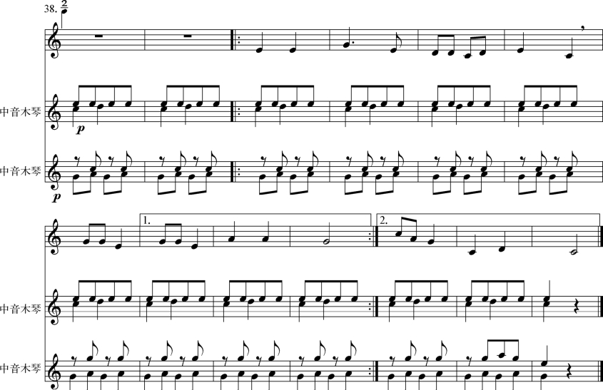 两遍主旋律(教师吹奏主旋律,中音钟琴和木琴仍保持,其余乐器各自演奏设计的伴奏音型