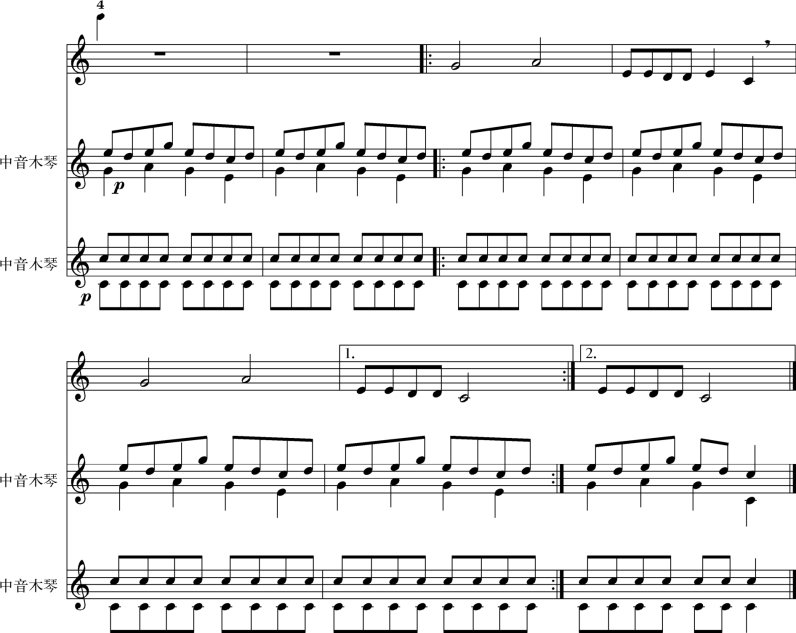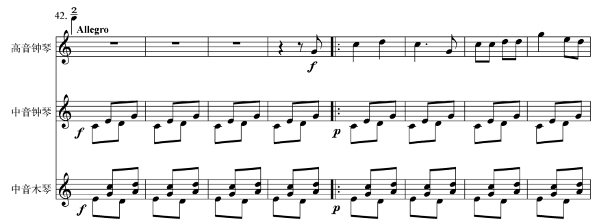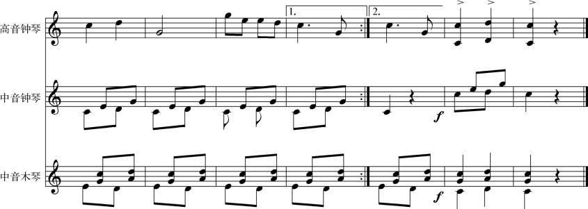 两小节的前奏(中音钟琴和木琴演奏创编的前奏伴奏音型)