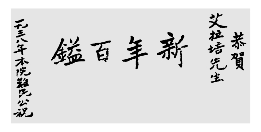 早晨7时许,张跑来告诉我说,他的妻子又犯病了。我迅速穿好衣服,同张一起第三次把她送进鼓楼医院。医生们似乎还一直没有诊断出他妻子究竟得的什么病。当我乘车回到住处时,人们用欢迎国王的礼炮迎接我,老百姓(我的可怜的难民)组成了夹道欢迎的队列,点燃了为庆祝新的自治政府的组成而从日本人那儿得到的许多鞭炮,向我表示敬意。然后,600个人围着我,向我献上了用红墨水写在白色包装纸上的新年贺信,所有的人向我三鞠躬。当我点头致谢,把贺信叠起来放进口袋时,他们都很高兴。遗憾的是贺信纸张大得出奇,无法放在这本日记中。下面是我的一位中国朋友对这封贺信的译文: