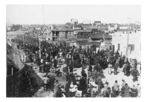 难民区一景(上海路),在一个临时搭建的售货摊(草棚)前。