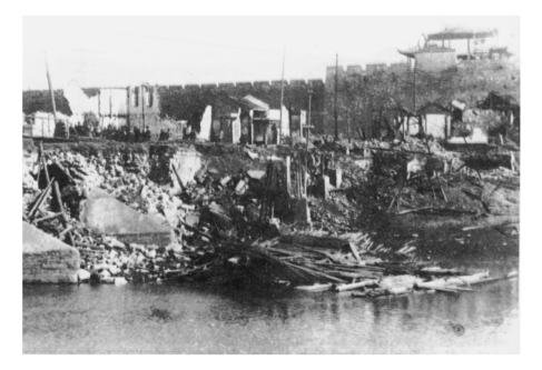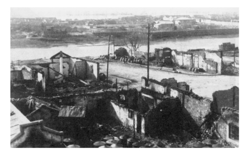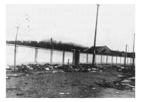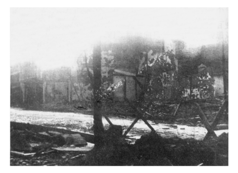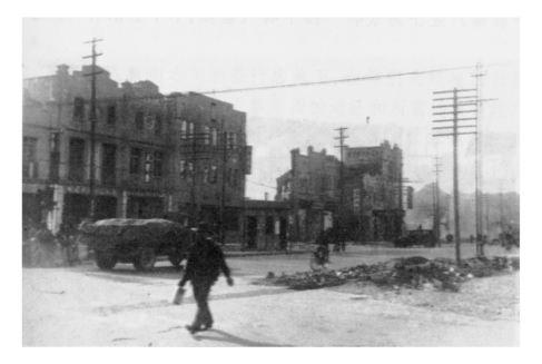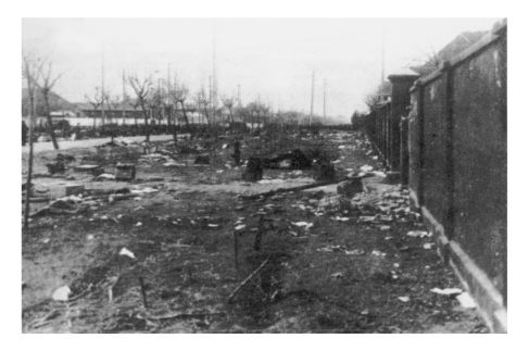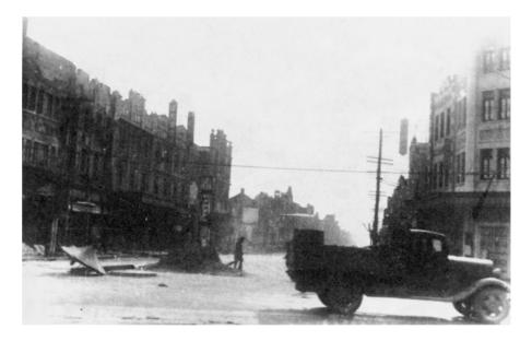 火烧后的断壁残垣的中山路。马路东侧部分已烧毁,西侧(安全区边界)有一些房子被焚毁。两侧的房屋均被日军士兵抢劫一空。