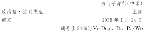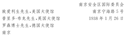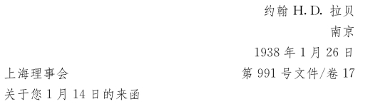 在下面的函件中,我们试图促使3国大使馆,即德、美、英使馆帮助我们解决一批大米储备问题。我们这批储备完好地存放在城内的仓库里,而现在被日本人占有了。但成功的希望渺茫,3位先生[57]都充满疑虑地摇摇头。不能设想,日本人会把这批可能还存在的储备交还给我们。恰恰相反,他们还会千方百计地阻止我们运输粮食,因为我们碍了他们的事。他们巴不得我们走。我们一天天不受欢迎,恐怕总有一天要被赶回上海。
