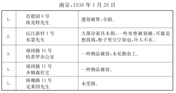 我再次发现,那名死去的中国士兵仍然在离我家不远的地方横尸露天。这种不可思议的局面还要持续多久?听说,一名日本高级军事官员正在来这里的路上,他不属本地驻军管辖,而直接隶属于东京方面。这名官员的任务是恢复这里的秩序,希望如此。也该是恢复这里的治安的时候了。一名年轻的美国人这两天在一名日军卫兵的陪同下驱车来到这里,向日本人出售大批的木材。这批货是一家英美木材公司的。这名派来帮助英国大使馆的男子说,在从上海至此途中的前50里中,他总共只碰见了约60人。南京还是他见到的唯一一座在人口方面值得一提的城市,沪宁之间的其他城市简直如绝了人烟。如果谁走出我们的安全区,穿过一条条空荡荡的马路,毫无遮挡地进入每一所房子,那景象真是令人触目惊心。所有的门都被砸开或是敞开着,接二连三的破坏让人感到野蛮而又不可理解。日本人想从这些废墟中捞到什么好处呢?为什么要杀死他们最好的顾客呢?应该考虑到这些人未来的购买力呀。这些问题暂时无法回答。城中还能见到浓烟冲天,纵火不断。人们不禁要问,这种毫无意义的毁灭究竟为了什么呢?日本大使馆的态度表明,他们中有人长时间以来对日军的做法深感羞耻。只要能做到,他们就试图作适当的遮掩,禁止出入南京城便是众多手段之一。借此可以使外界对南京目前的状况一无所知,可这也只能在短时间内奏效。自从德、美、英大使馆重新派驻代表之后,有数百封信函发往上海,详细地报告这里的局势,更不用说各大使馆发的电报了。安全区是南京唯一有生气的地方。一些铺面逐渐在市中心的马路上出现了。一大清早,天刚蒙蒙亮,就有中国人带着他们自认为值钱的、劫后余存的物件进入安全区,寻找有兴趣的买主。主顾们大都是些除了购买食品之外还有些节余的人。这里,熙攘的人流穿梭在店铺之间,在贫困中形成了临时的年前集市。在极度的困境之中,一切物品的价值都得按照最急需的食品和享受品的价格重新估算,比如大米、面粉、肉、盐、蔬菜以及烟!!