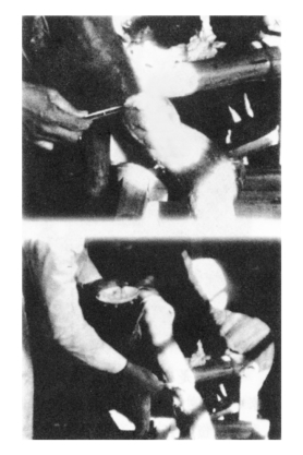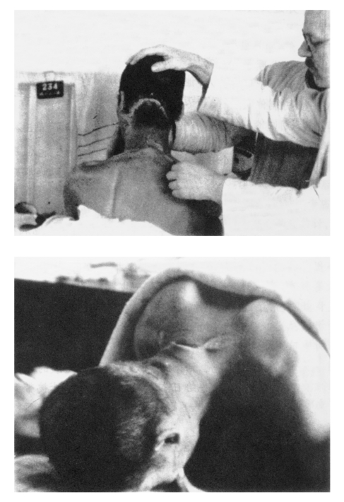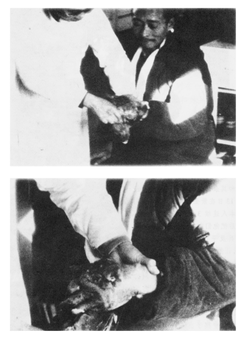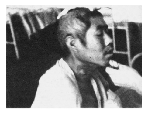 2)一个日本兵向一家搪瓷店的职员要香烟,因为他没有香烟,头上就被这个日本兵劈了一刀,这一刀砍破了他一只耳朵后的脑壳,脑子都露了出来。这是在这个受伤者被送进教会医院6天后拍摄的。大家可以看到脑子还在搏动,一部分脑浆从伤口外溢,他身体的右侧因此已完全瘫痪,但病人并未失去知觉。他在被送进医院后还活了10天。