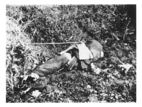 4)1月11日,3个日本士兵强迫这个十三四岁的男孩把蔬菜挑到城南,在那里他们抢走了他的钱,用刺刀向他背部刺了两刀,一刀刺进下腹。两天后他被送进教会医院时,他的内脏从伤口里拖出来约一尺长。送到医院5天后他死去了。给他摄影时,病人非常痛苦,连医生都不敢把伤口上的绷带解开。