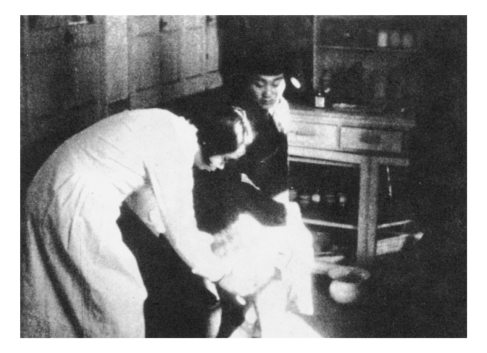 7)这个男子的家在南城门内。日本人于1937年12月13日入侵这座城市时,打死了他的两个兄弟,用刺刀刺进了他的胸部。他在12月27日以后才被送进医院。这个画面是在鼓楼医院的药房里拍摄的。——这期间他必定已经死去,因为他胸腔里格格的响声说明他受了重伤。