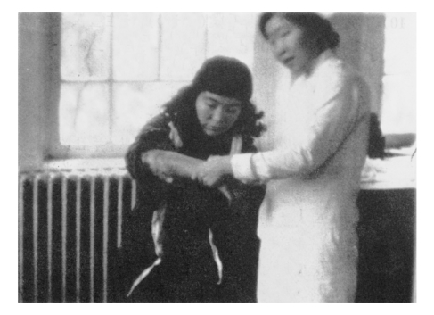 此人是南京附近长芦乡的一位农民。一名日军士兵闯入他家中,向他索要姑娘。当他回答说“没有”时,这个日本兵便将其手部射伤。当时在鼓楼医院治疗时,其伤势非常严重,此画面是偶然拍下的。