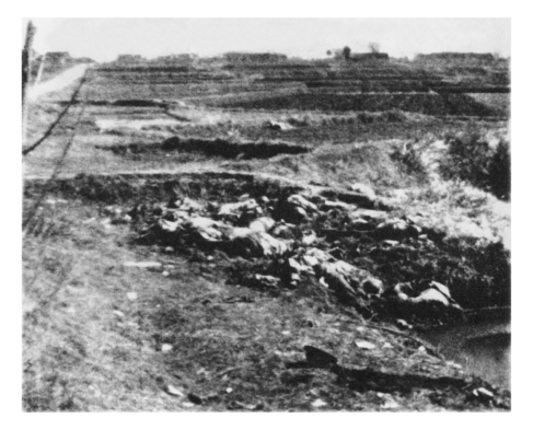 2)1937年12月16日,上海路。中国妇女下跪请求日本士兵不要杀害她们的儿子和丈夫,他们仅仅是因为被怀疑当过兵而被无情地驱赶在一起。成千上万的平民也被这样用绳索捆绑起来,驱赶到下关的扬子江边、众多的小池塘边和空旷的场地上,在那里他们遭到机关枪扫射、刺刀砍杀、步枪齐射,甚至用手榴弹处决。