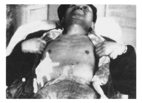 这是守城部队的一名士兵。他和其余8 名同伴于1937年12月13日在紫金山向日本人投降。日本人连续3天不给他们吃喝,随后把他们和其他200多名被俘士兵及平民押至江边一块空地上,让他们站成3长排,用机枪射杀。他虽然未受伤,但也随他人一起倒在地上。日本人向他们的身上浇上一种液体燃料,点燃后立即燃烧了起来。由于天色已黑,这名士兵乘人不备,成功地从尸体堆中爬了出来。1937年12月18日,他终于到达了教会医院。他的伤口难以治愈,但当两个月后拍摄此画面时,他已基本康复了。