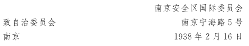 谨请允许我用书面形式确认不久前与尊敬的贵委员会代表所作的商谈。商谈中我们一致认为,由前市政府交给我们国际委员会的全部行政管理责任将随着自治委员会的成立而结束,并移交给现已完全承担了这种责任的贵组织。从这时起,我们委员会将是一个纯民间的救济组织。就我们的考虑,安全区也应该由此停止存在。