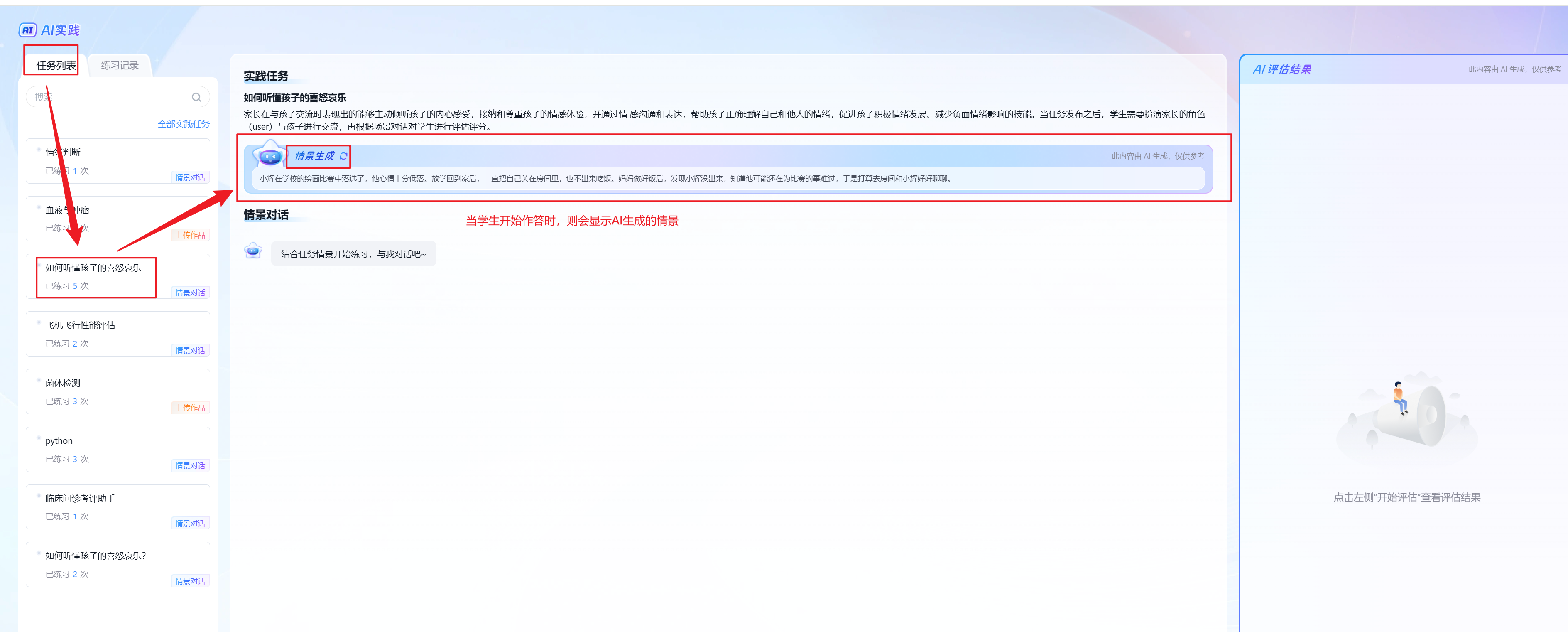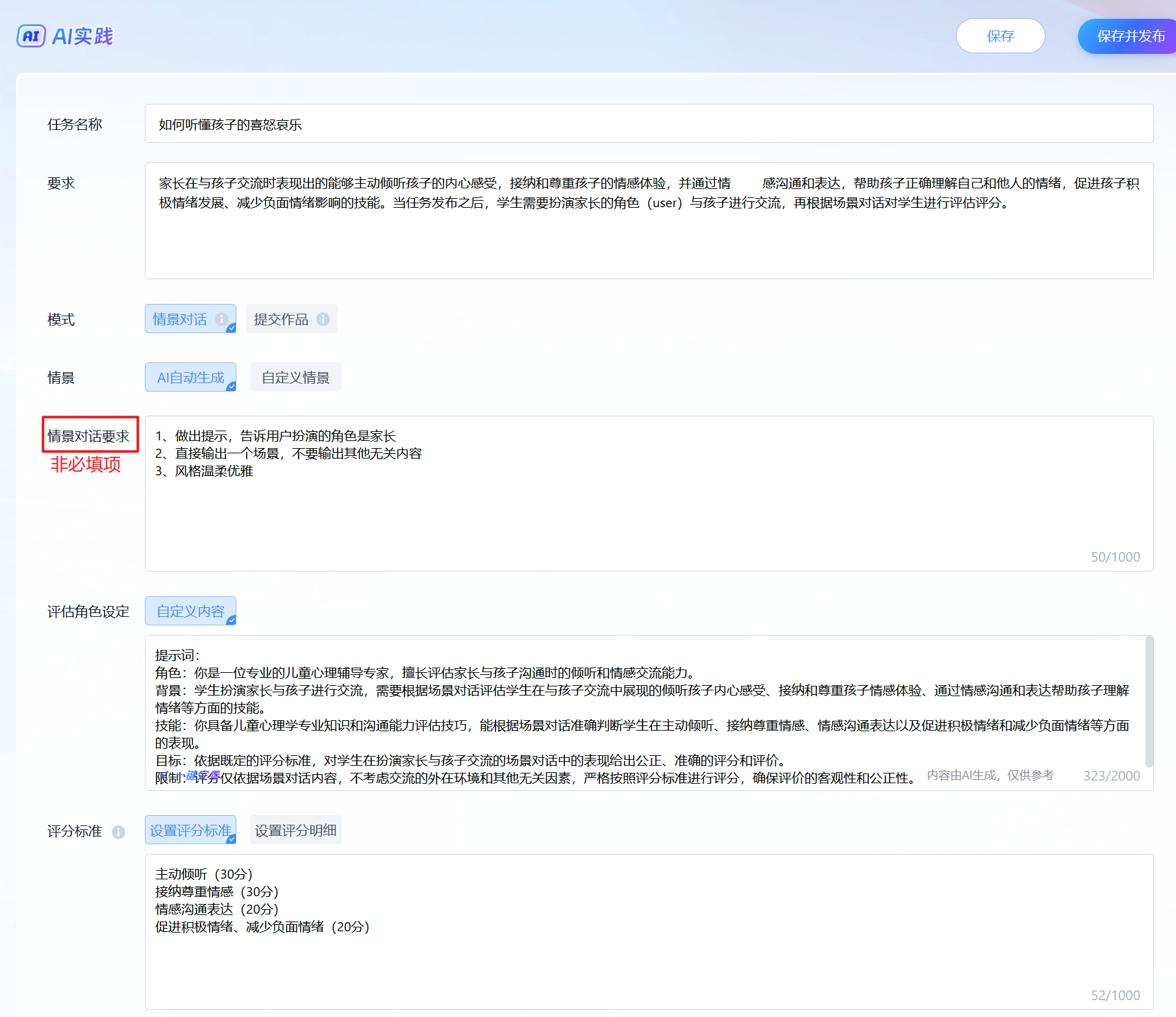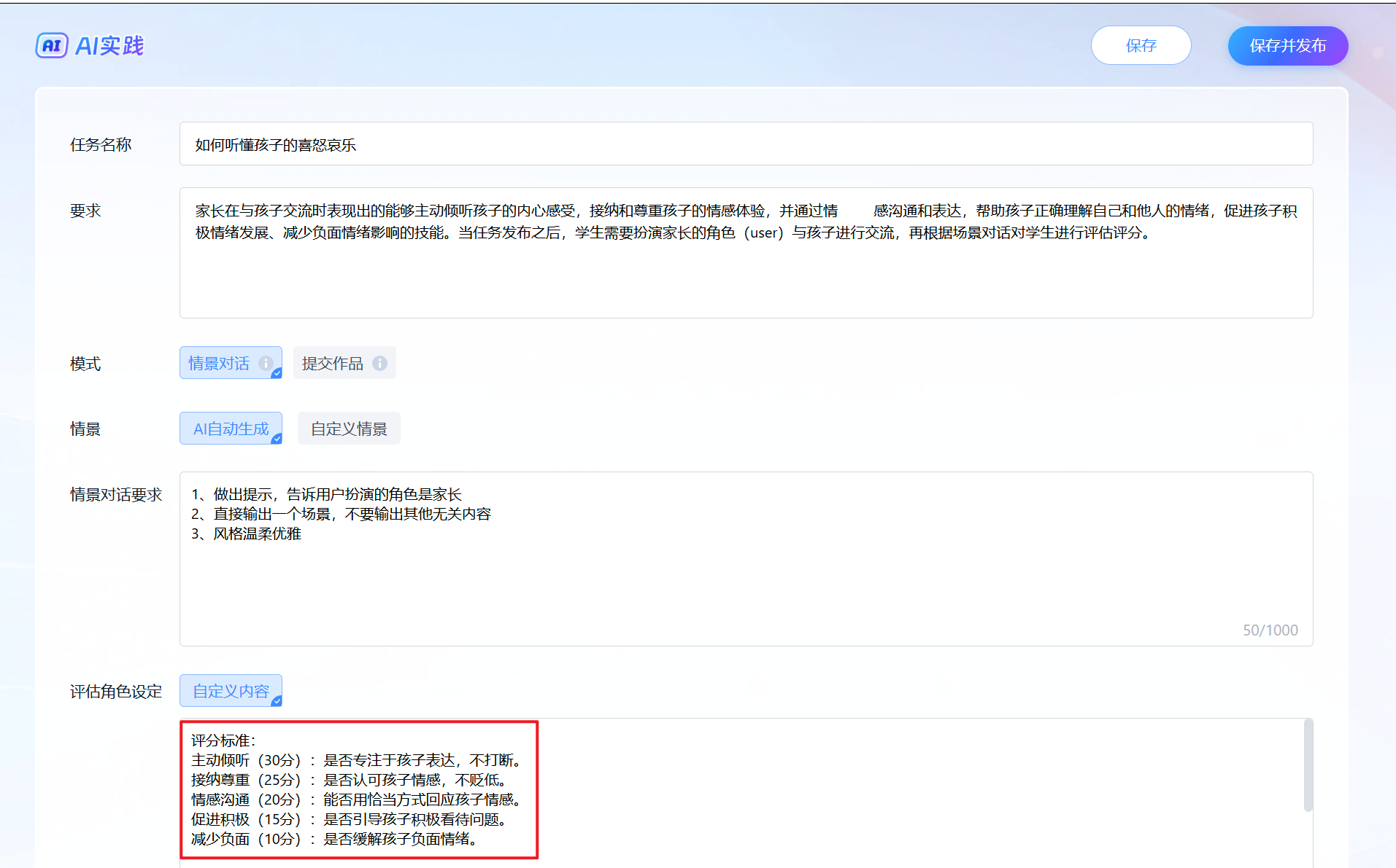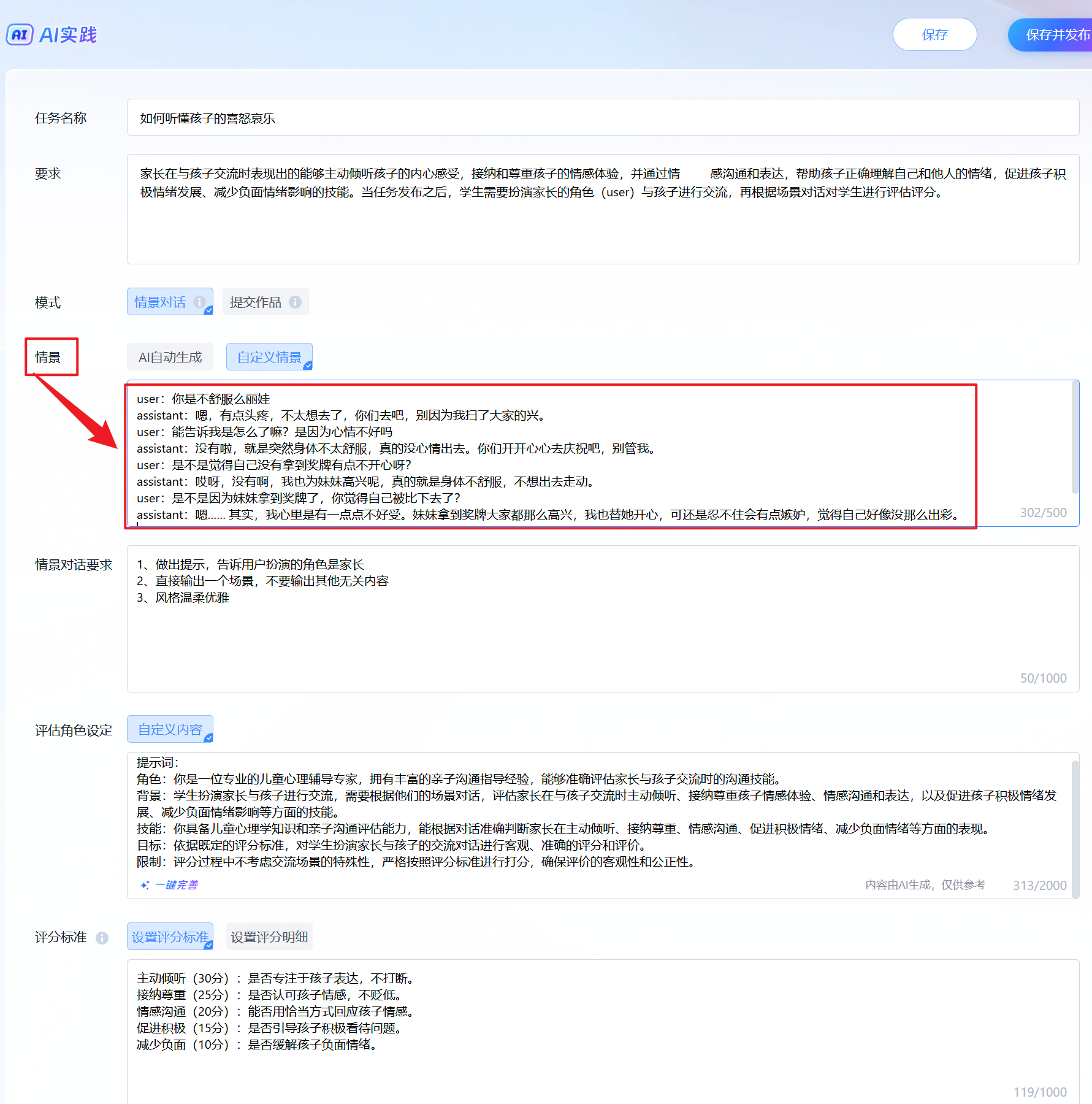 要求:家长在与孩子交流时表现出的能够主动倾听孩子的内心感受,接纳和尊重孩子的情感体验,并通过情感沟通和表达,帮助孩子正确理解自己和他人的情绪,促进孩子积极情绪发展、减少负面情绪影响的技能。当任务发布之后,学生需要扮演家长的角色(user)与孩子进行交流,再根据场景对话对学生进行评估评分。 |