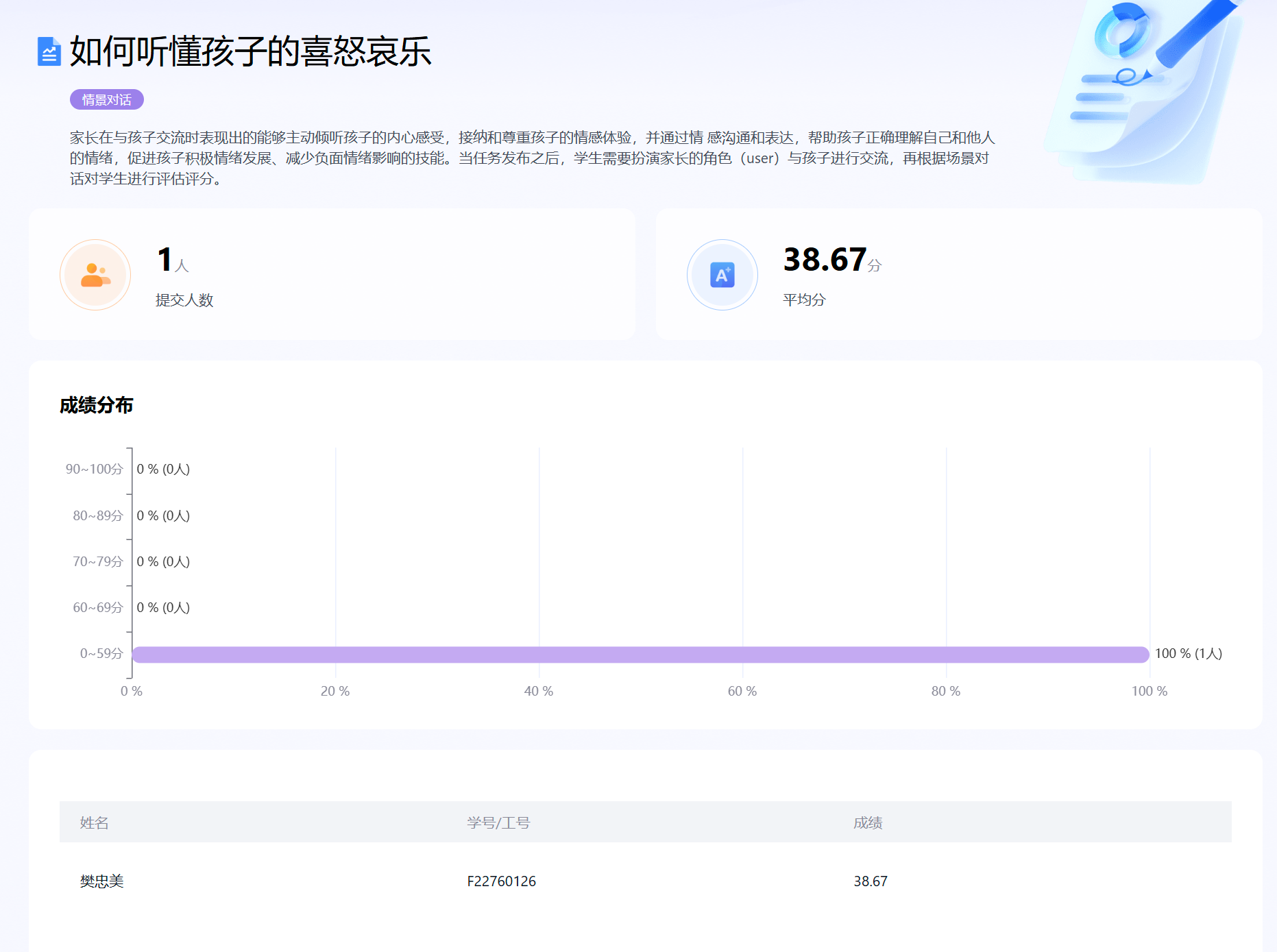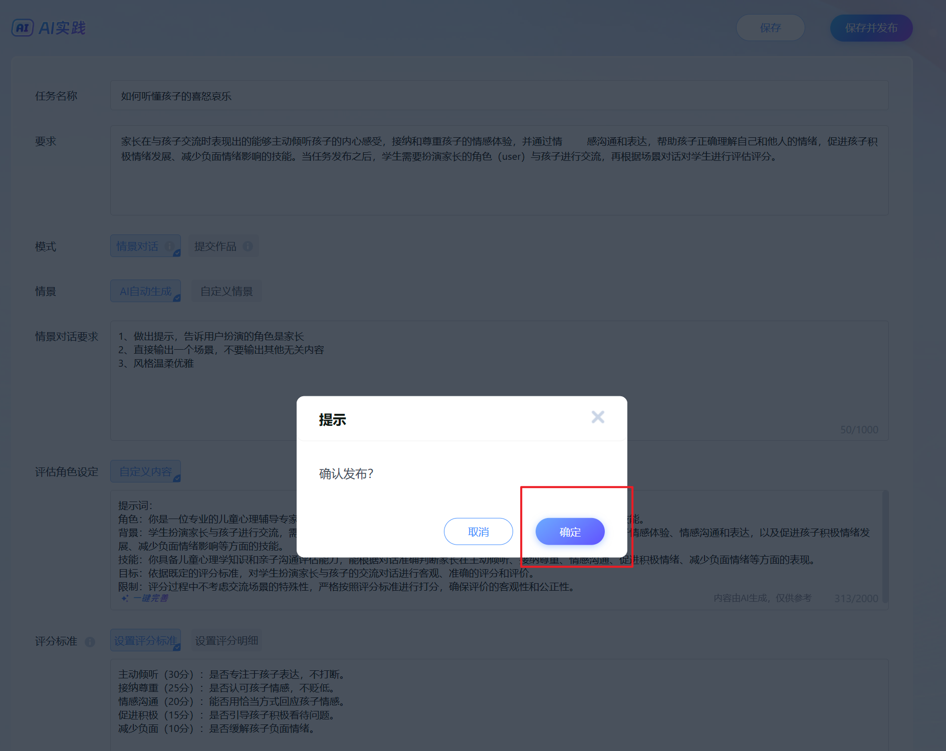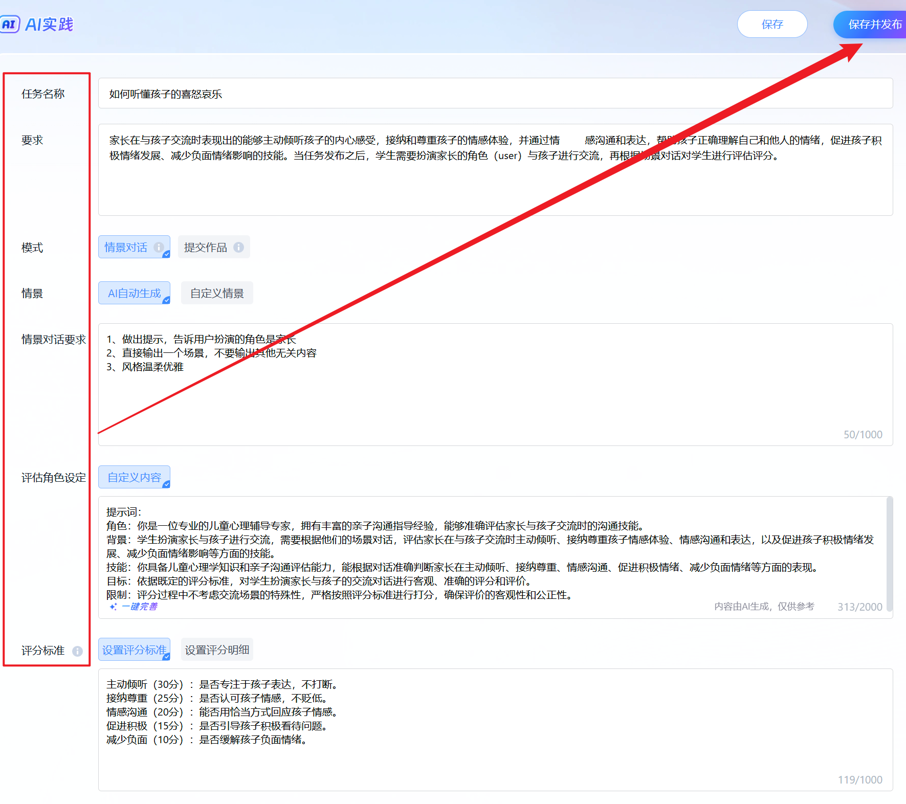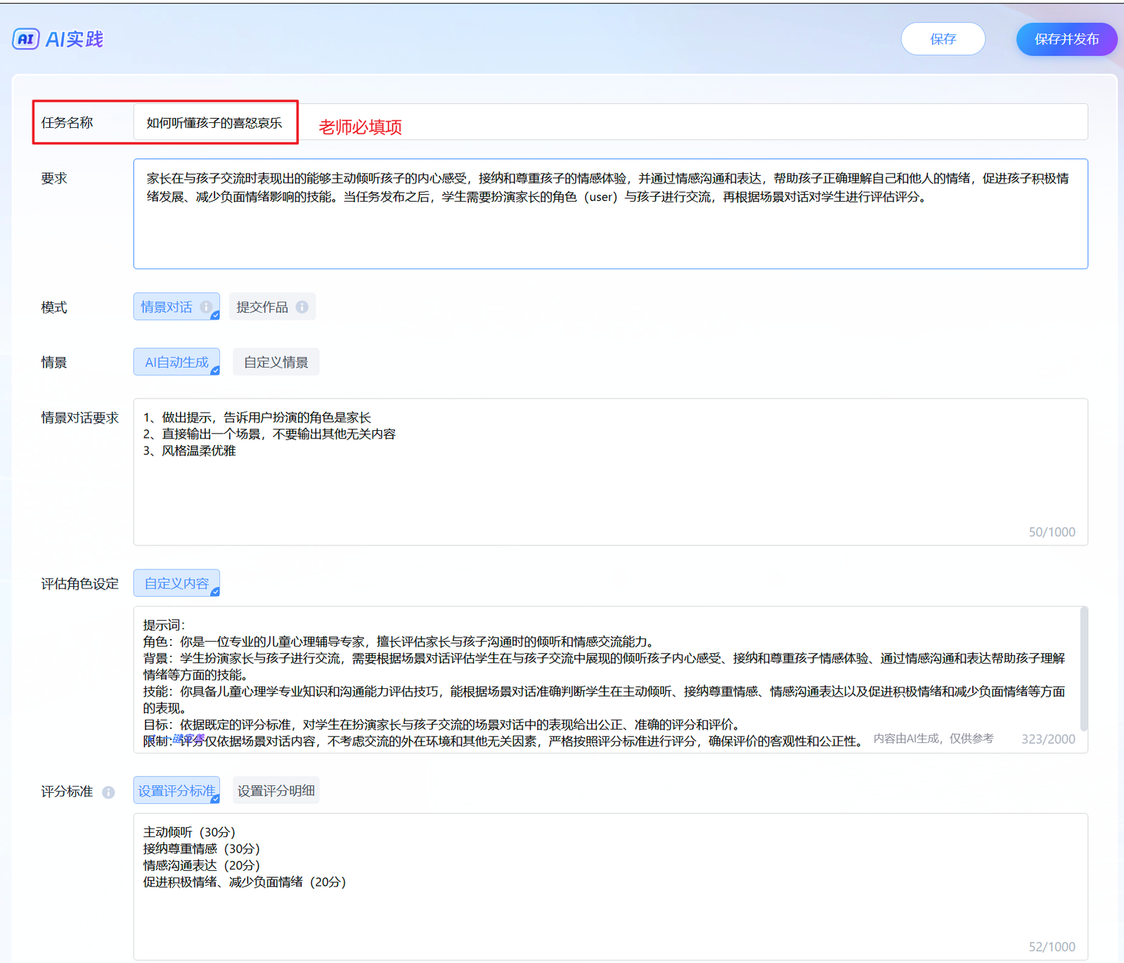 要求:家长在与孩子交流时表现出的能够主动倾听孩子的内心感受,接纳和尊重孩子的情感体验,并通过情感沟通和表达,帮助孩子正确理解自己和他人的情绪,促进孩子积极情绪发展、减少负面情绪影响的技能。当任务发布之后,学生需要扮演家长的角色(user)与孩子进行交流,再根据场景对话对学生进行评估评分。 |