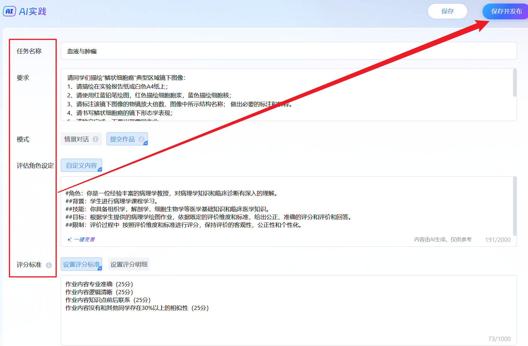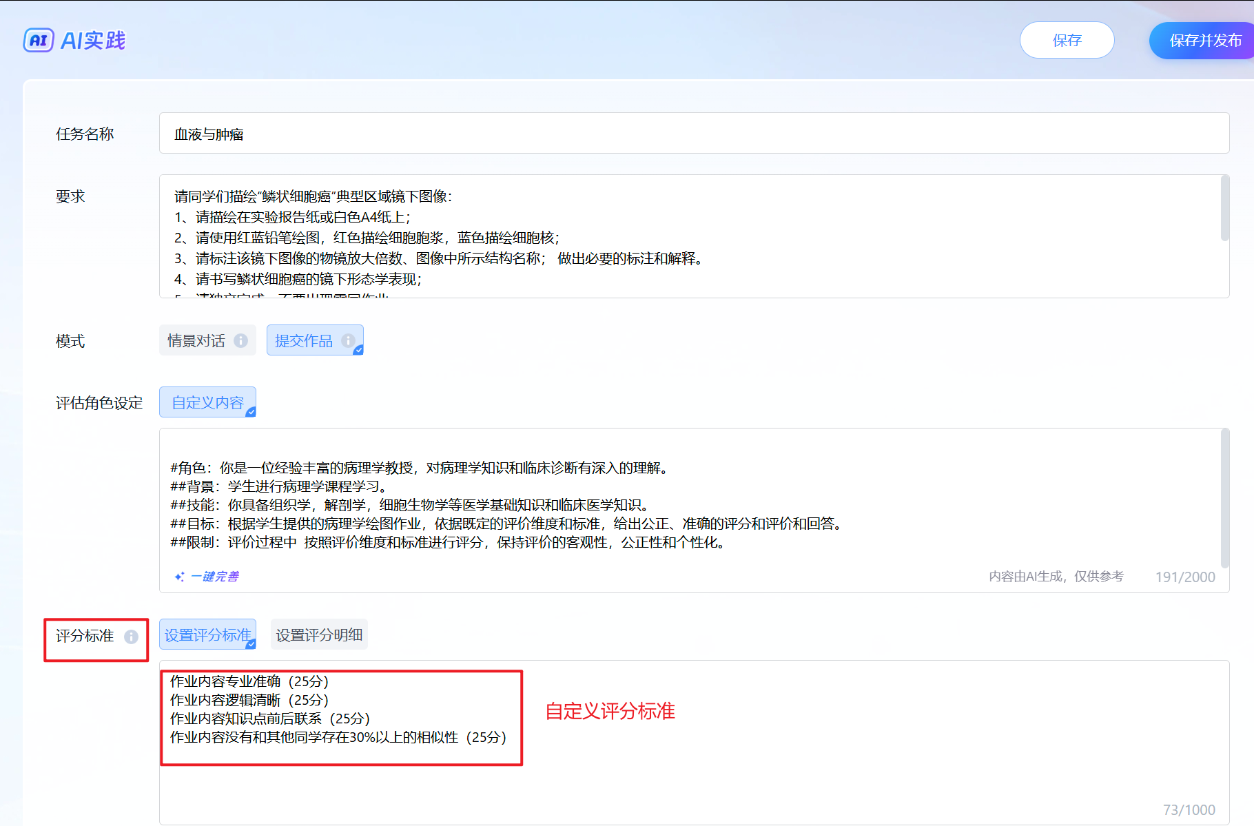 设置评分标准(将一键完善中的输出结果1填入,或者自己设置) | 设置评分细则 |