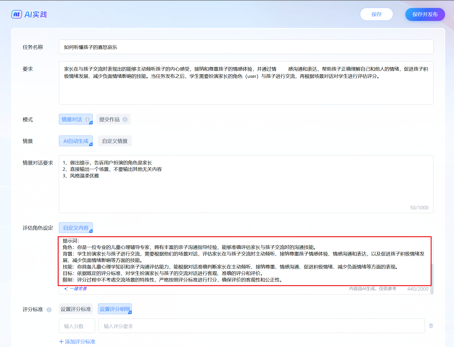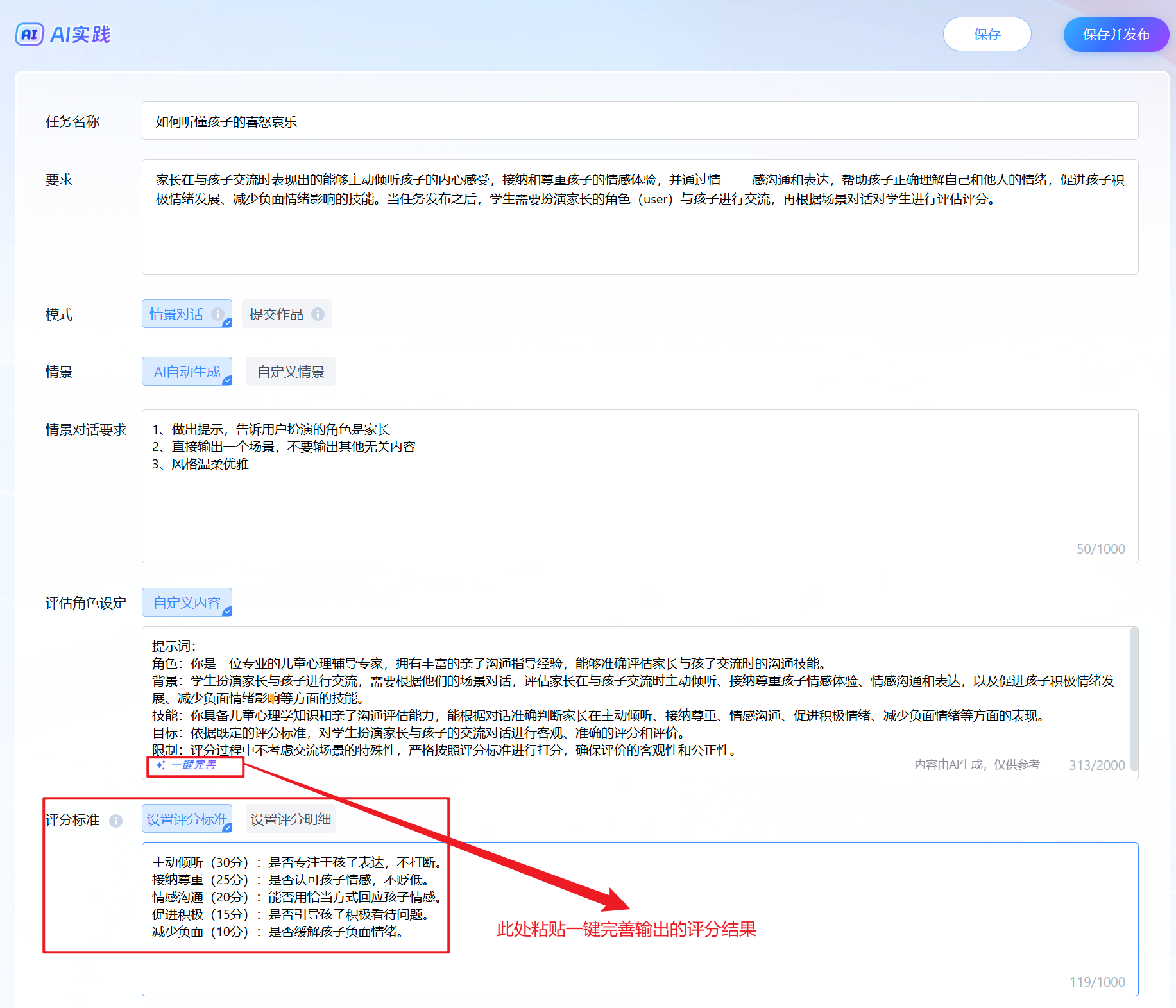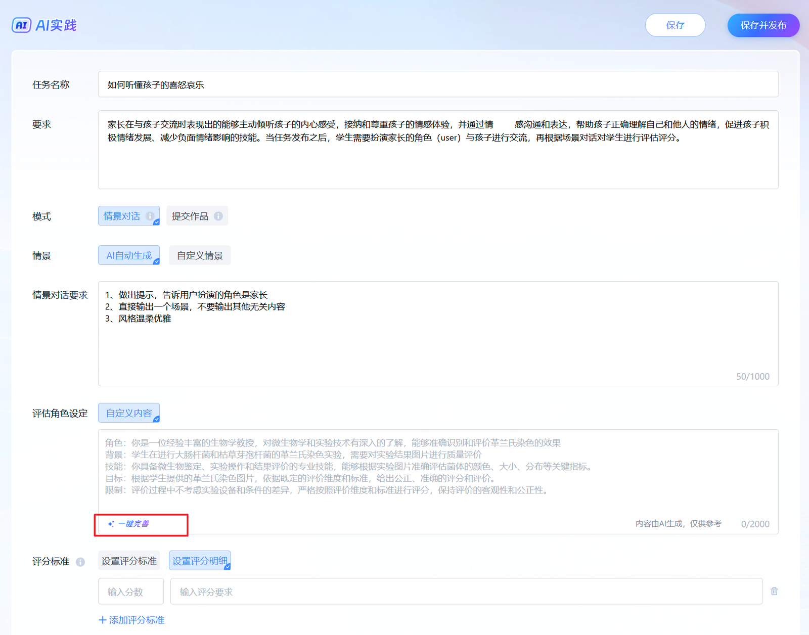 注意:情景对话类选择一键完善之后,需要将输出的“评分标准”部分删除