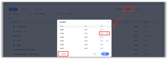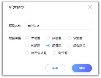 2. 进入题库界面后,点击右上角的【题库管理】,可以删除不使用的题型,也可以【新建题型】,点击【新建题型】,输入题型名称,选择适合该题型的类型,点击确认。