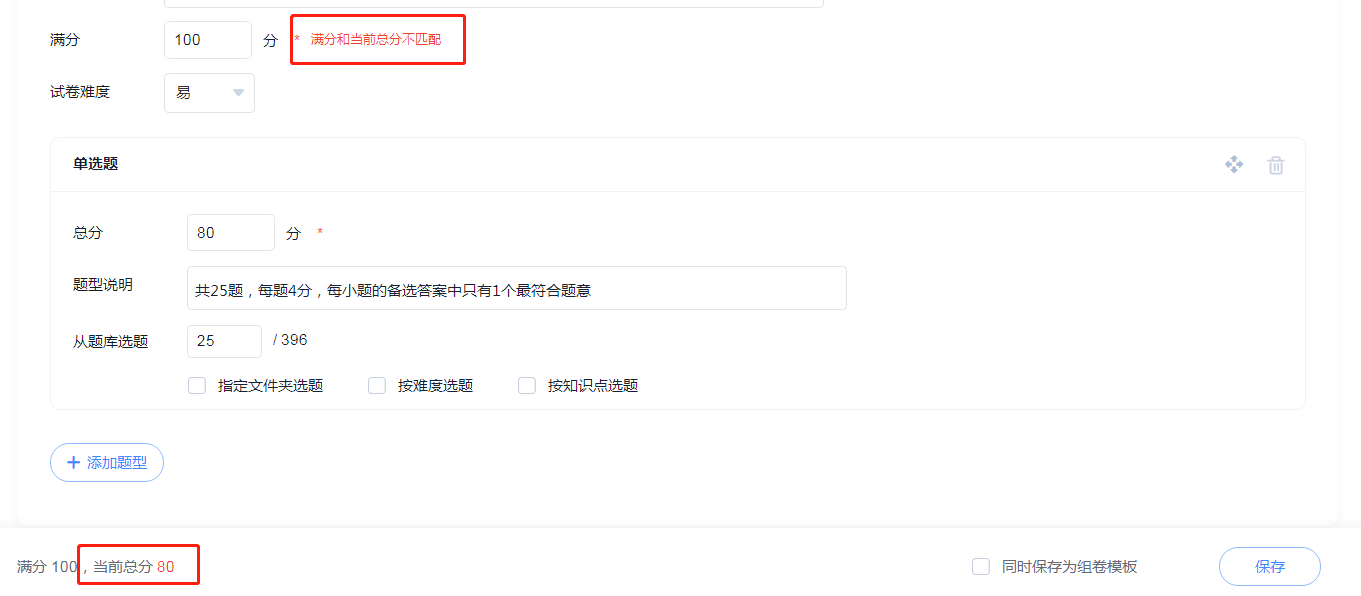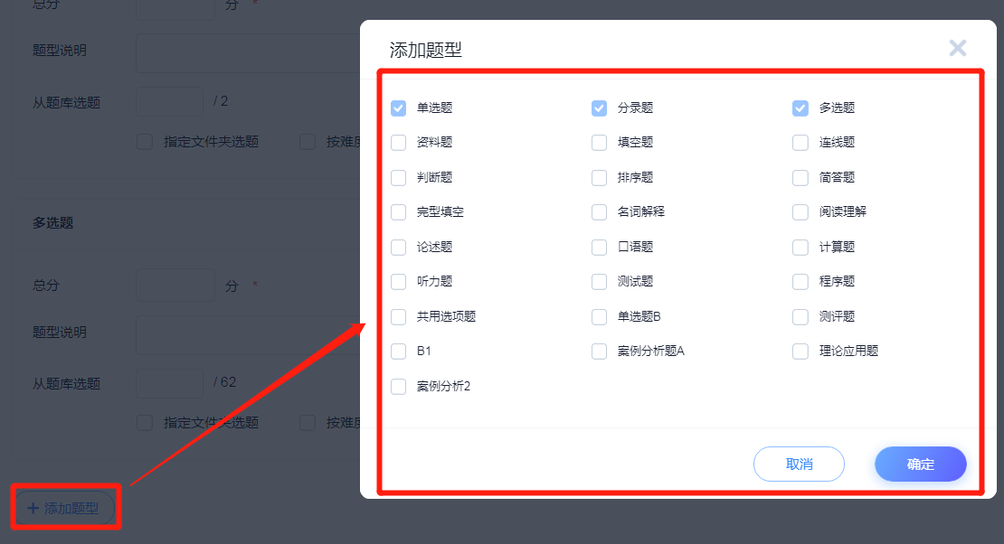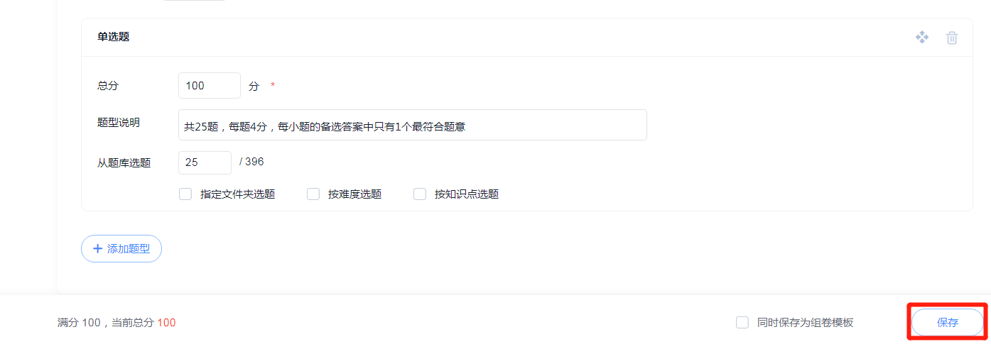 4. 页面下方,可以【添加题型】,添加对应题型后,设置题型总分,题型说明,选题数量和规则等。