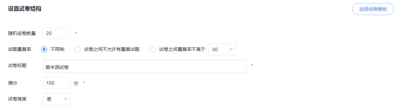 2.进入随机组卷界面,输入大于1的组卷数量,会出现【试题重复率】的设置。输入试卷标题、分值,难度等进行试卷设置。