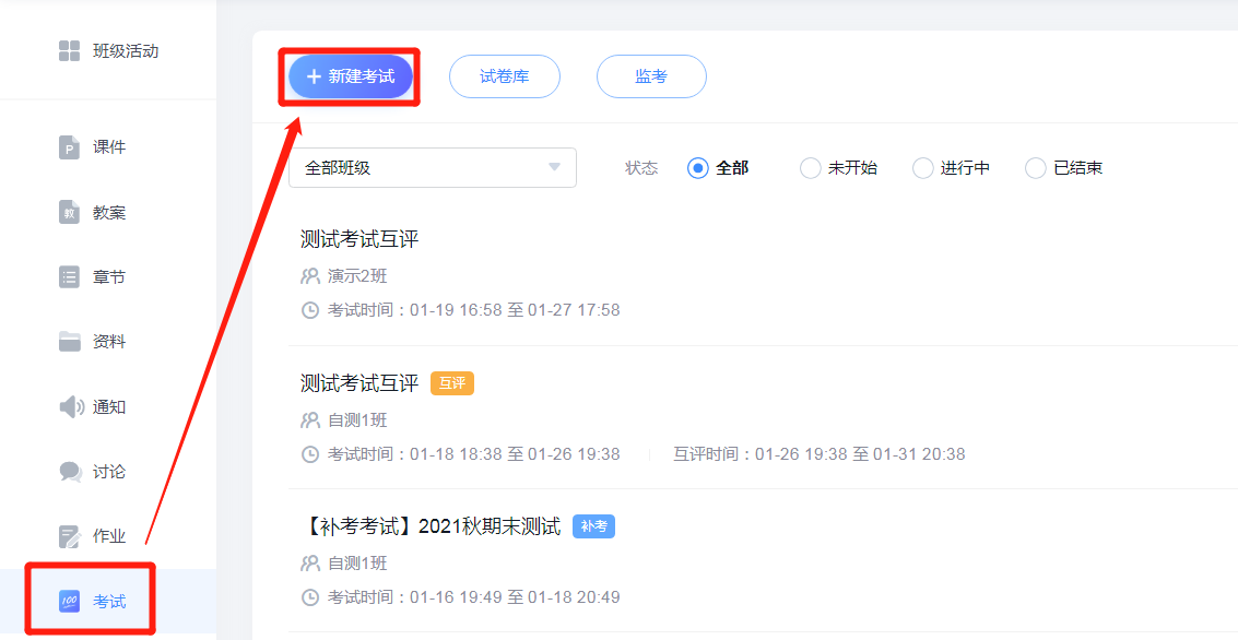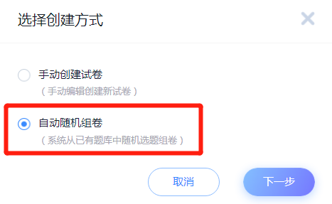 1. 进入课程,点击【考试】——【新建考试】,选择【自动随机组卷】。