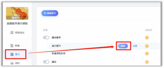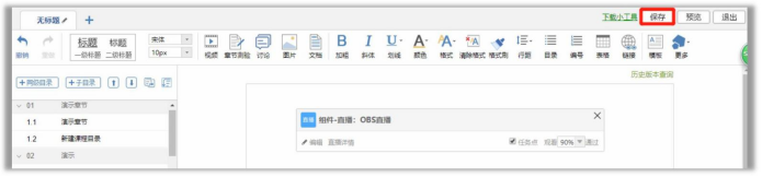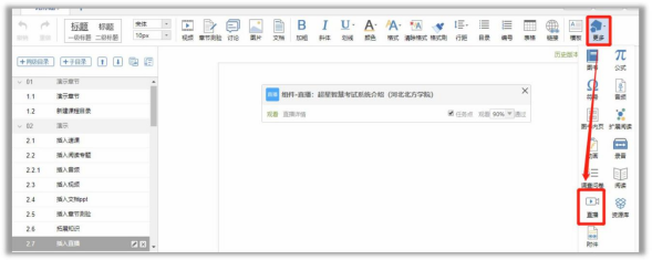 6. 在章节中插入直播,进入“我教的课”,点击章节,进入章节编辑,从“更多”中找到“直播”。从已有直播中选择对应的直播插入到章节中,编辑完成后,点击右上角进行保存。