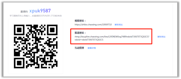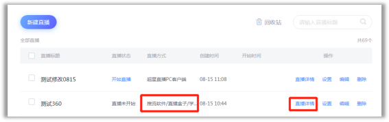 2. 点击建好的直播的“直播详情”,获取“推流地址”。