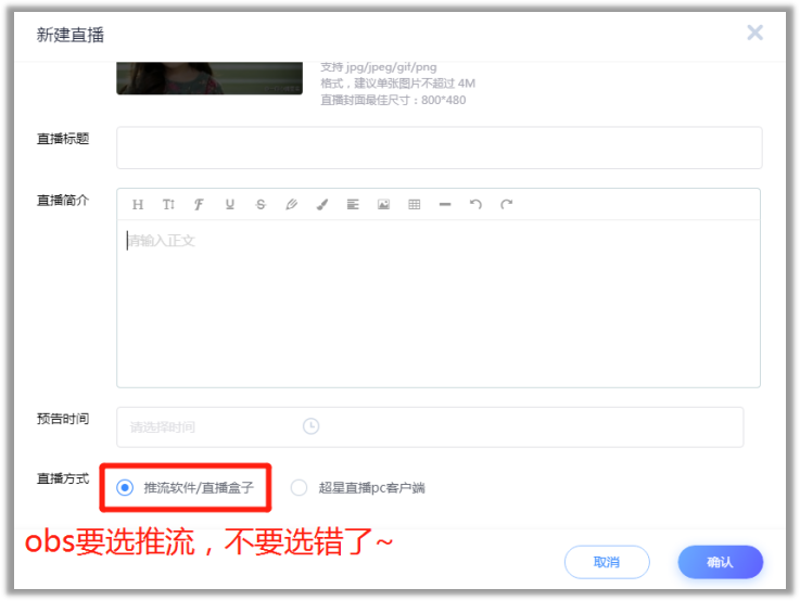 1. 点击左侧“个人直播间”,点击“新建直播”,选择“推流软件/直播盒子”,设置直播时间。