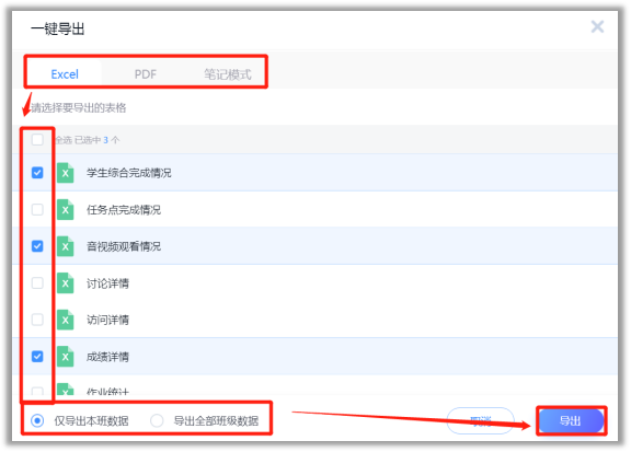 2. 选择要导出的文件格式,勾选要导出的学生成绩模块,可以选择本班成绩或全部班级成绩,选择完成后,点击【导出】。