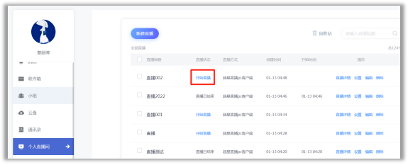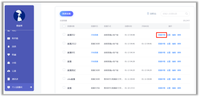 ①直播预设:进入教学空间,点击【个人直播间】——【新建直播】,选择超星直播客户端,进行直播预设。