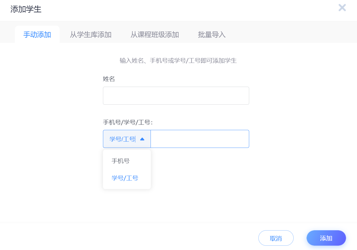 1.【手动添加】:适用于添加个别学生,输入学生的姓名、学号或手机号,可以直接添加,该添加方式也可以添加非本单位的学生。