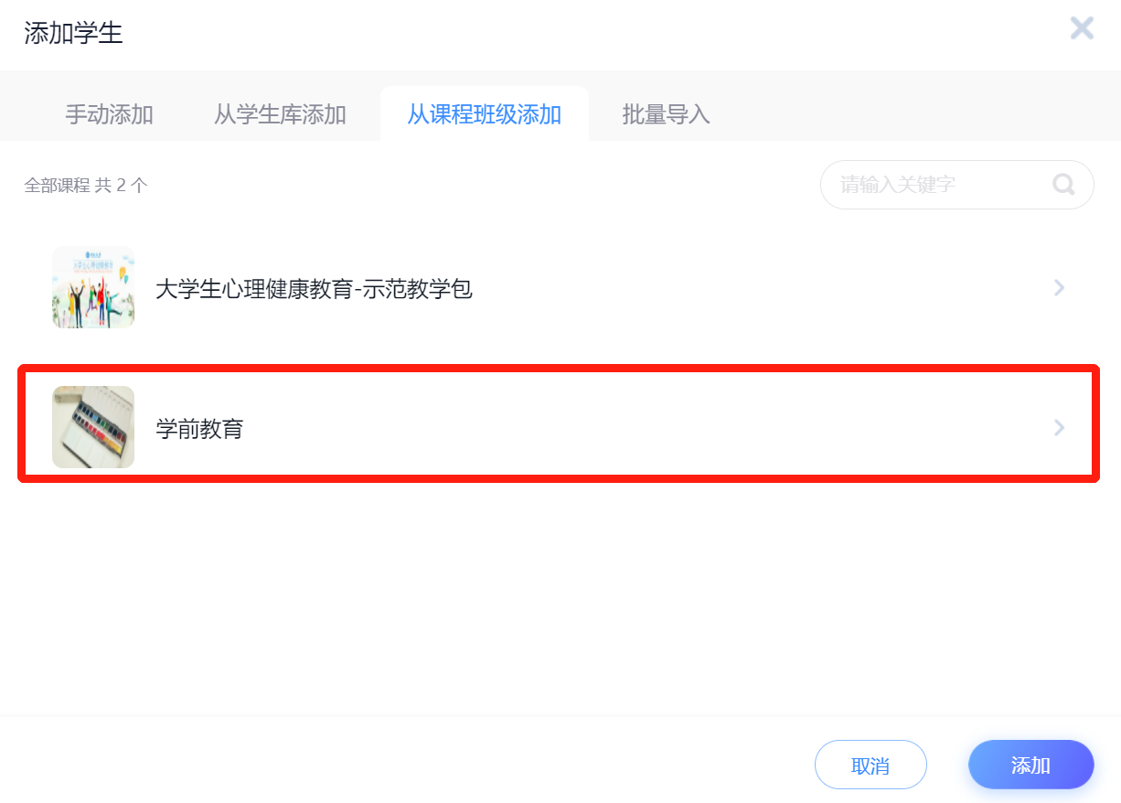 3. 【从课程班级添加】:适用于该老师账号其他的课程下有该班级的学生,可以通过选择其他课程下的班级进行添加。