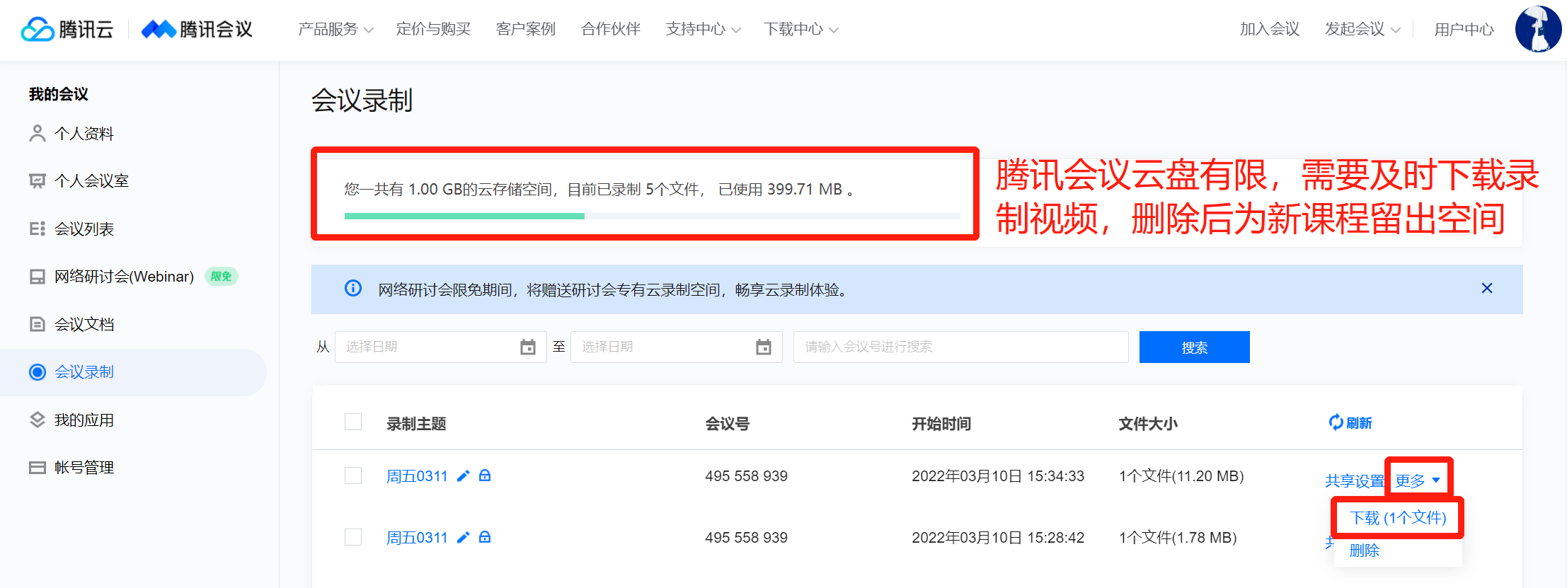 腾讯会议云端空间有限,需要及时下载云端录制的文件,为新的直播留出足够的录制空间。