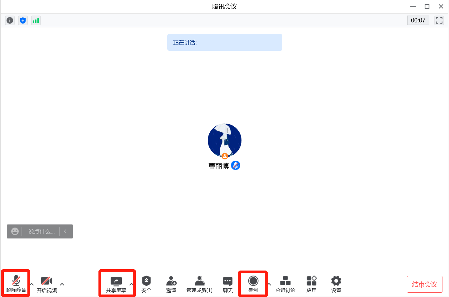 进入腾讯会议后,页面下方有操作按钮,常用的功能有话筒、共享屏幕、录制等功能。老师可以在课前多熟悉下各按钮功能。