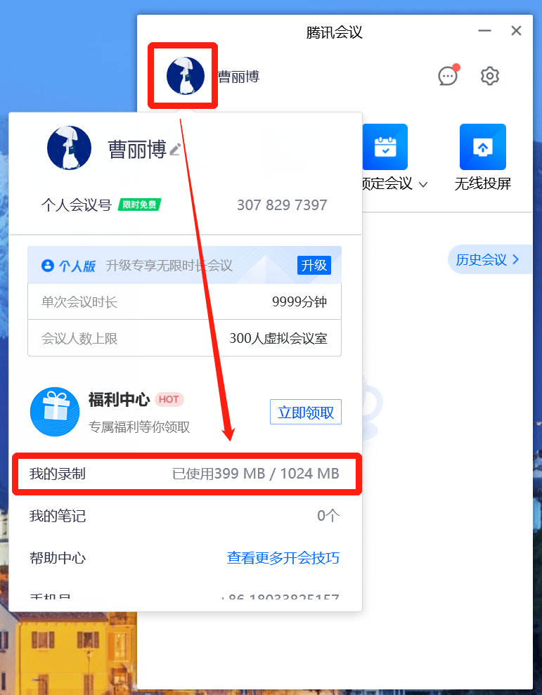 打开腾讯会议APP,点击头像,找到【我的录制】,点击会跳转到浏览器界面,在会议录制的界面,可以看到腾讯会议云录制剩余空间。