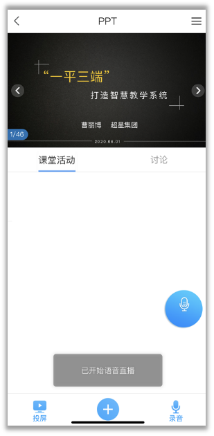 教师选择一门课程,进入班级开始上课,点击手机下方中间蓝色加号按钮,找到同步课堂,选择准备好的PPT开始上课。