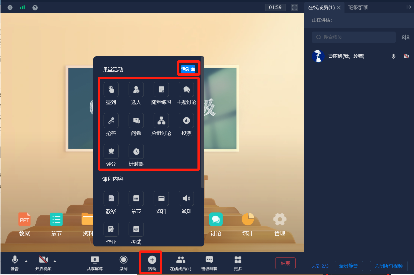 进入泛雅课堂后,页面下方有操作按钮,常用的功能有静音、共享屏幕、录制、活动、对比等功能。老师可以在课前多熟悉下各按钮功能。