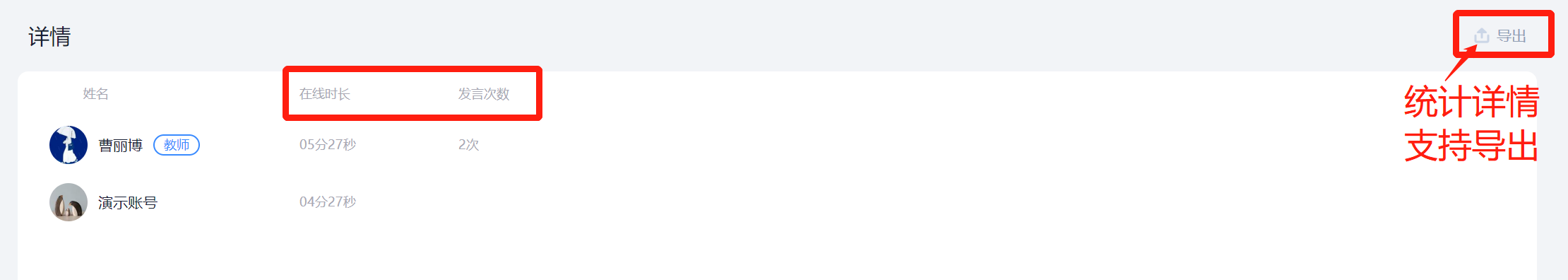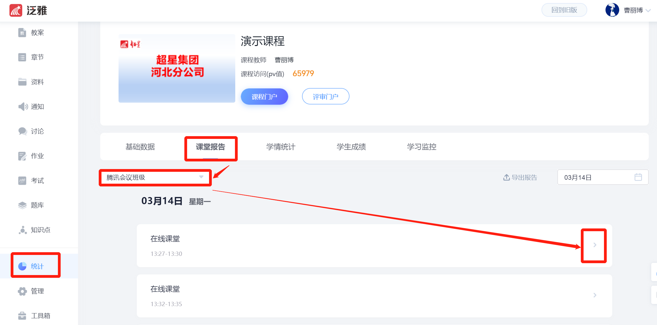 进入课程后,在左侧导航栏找到【统计】——【课堂报告】,切换到上课的班级,找到对应的【在线课堂】点击后面对应的箭头,可以看到参与课堂的学生名单及在线时长,发言次数。