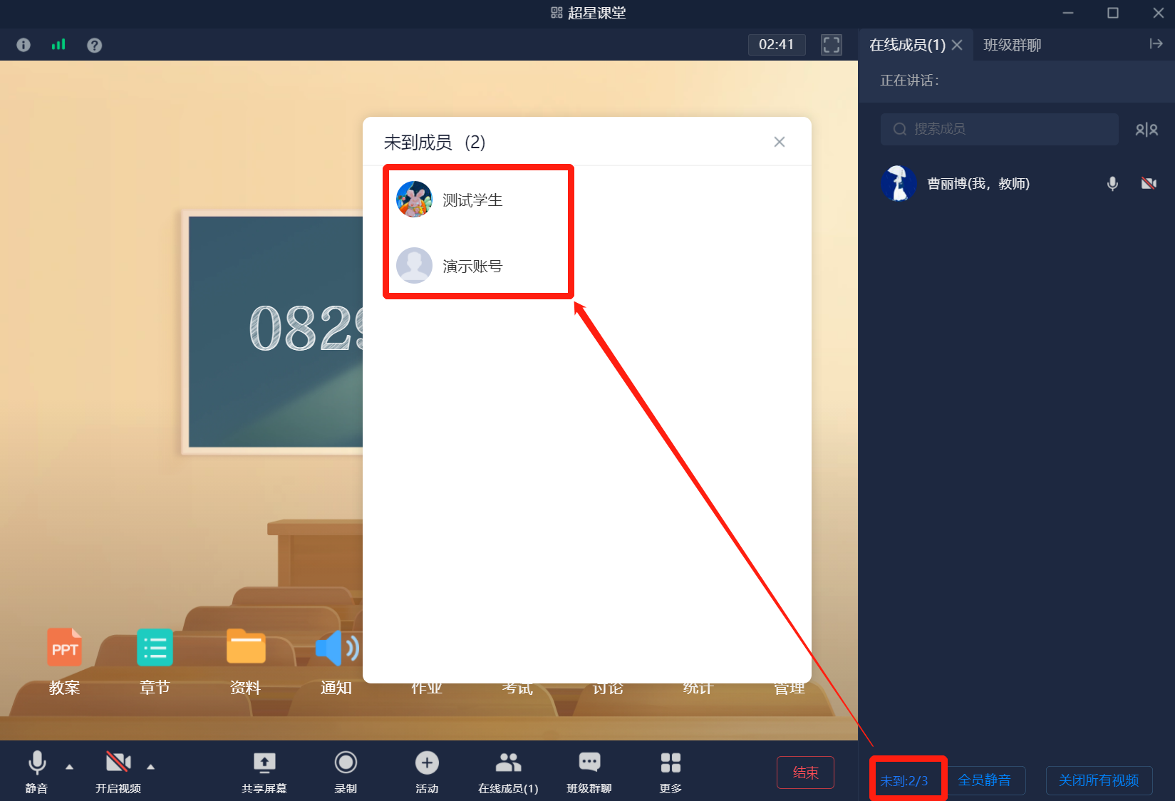 在泛雅课堂界面,右下角,可以快速查看未到课堂的学生名单。