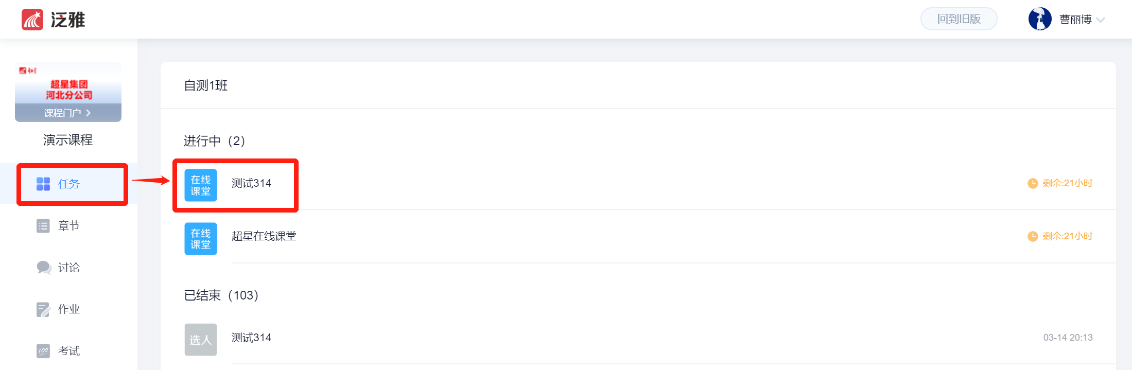 进入上课的课程,在左侧导航栏找到【任务】列表中找到进行中的【在线课堂】,点击进入,点击加入课堂。