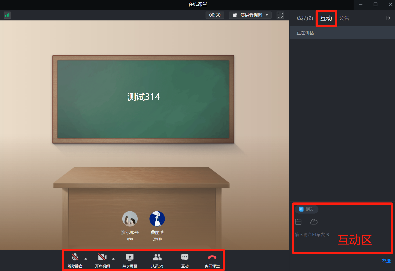 进入课堂后,可以解除静音进行发言,也可共享屏幕,也可以进入互动区进行发言互动,参与课堂活动。
