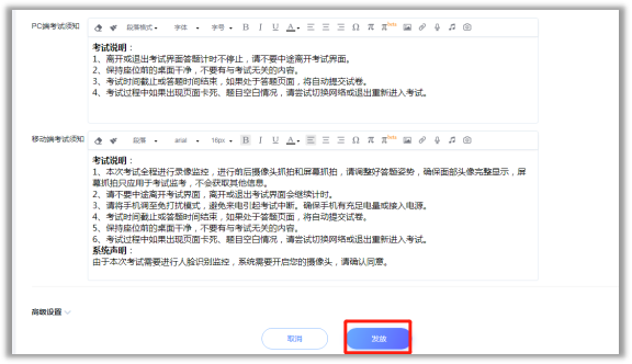 设置防作弊的相关设置,设置完成后点击页面最下方的发布。