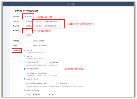 ③选择发放的班级,设置考试开始和结束的时间,设置考试限时。