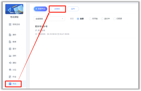 ①进入课程后,在左侧导航栏找到【考试】——【试卷库】,点击进入。