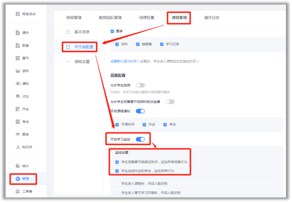 ①学习监控的开启:进入课程后点击管理——课程管理——学生端配置,选择开启学习监控。