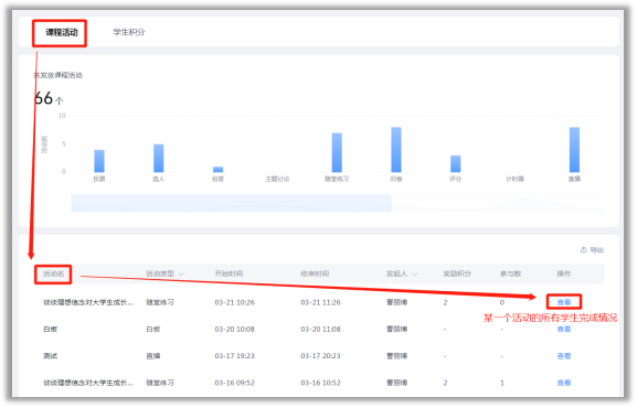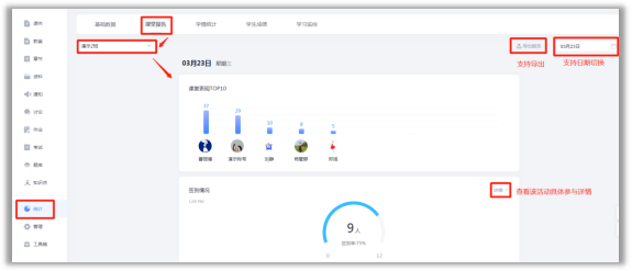 课堂报告会按照时间轴记录当堂课程整体情况,包含本节课学生课堂表现TOP10,签到详情,课堂回顾。课堂报告支持导出。